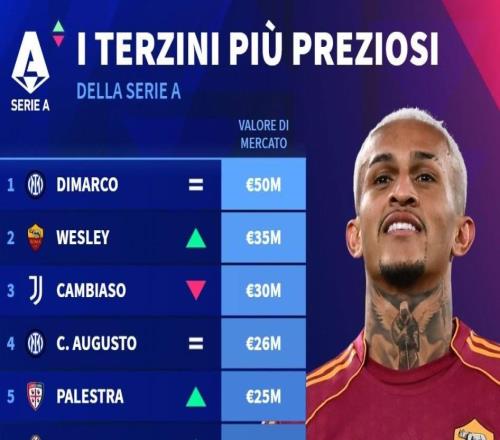 德转列意甲边后卫身价前10:国米4人上榜,迪马尔科5000万第1 -
