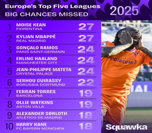 2025年五大联赛错失绝佳机会榜:基恩、姆巴佩27次并列第1 -